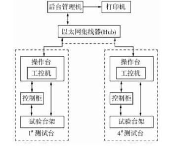 后臺管理機用于管理多個操作臺中的測試試驗據(jù)。通過后臺管理機,可備份操作臺工控機中的試驗數(shù)據(jù),對測試數(shù)據(jù)可進行各種查詢,匯總、打印各種報表等,避免了逐個查詢每一測試臺工控機中數(shù)據(jù)的繁瑣操作,也有利于保證測試數(shù)據(jù)的安全性。操作臺主要完成各參數(shù)的測量、各種試驗狀態(tài)的讀取和判斷,控制測試系統(tǒng)完成各種試驗項目。控制柜中安裝了執(zhí)行機構(gòu),主要功能是執(zhí)行操作臺工控機發(fā)出的指令,完成對試驗對象的控制。