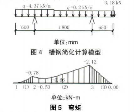 1)載荷。鋼槽后邊壓重10袋水泥,簡化為線載荷P=10x0.05x10/1.2=4.17(kN/m)。懸臂端承受載荷N=2p=1.59x2=3.18(kN)。