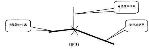 5、當(dāng)繩頭到達(dá)滑輪組時(shí),將第一根鋼絲繩穿入對(duì)應(yīng)的滑輪,拉出l以米左右,再用電葫蘆將新鋼絲繩的A端拉上,兩繩的連接位置為1米左右,其目的是為了新繩能順利通過機(jī)械室A端下方的孔洞,電葫蘆提升鋼絲繩時(shí),提升機(jī)需配合下降,由于電葫蘆比提升機(jī)速度快,操作人員需密切關(guān)注鋼絲繩的補(bǔ)給速度,防止電葫蘆鋼絲繩與提升機(jī)不同步被拉斷,當(dāng)鋼絲繩A繩頭拉到平衡臂螺栓孔時(shí),提升機(jī)需停止,點(diǎn)動(dòng)電葫蘆將新繩拉緊受力。由于兩繩連接或提升機(jī)停車誤差,新繩頭可能超過或1氐于平衡臂螺栓孑L,可找一個(gè)固定點(diǎn)用量具進(jìn)行測(cè)量計(jì)算,確定尺寸后再看卷筒上多余幾圈鋼絲繩,經(jīng)過卷筒周長(zhǎng)和測(cè)量的誤差尺