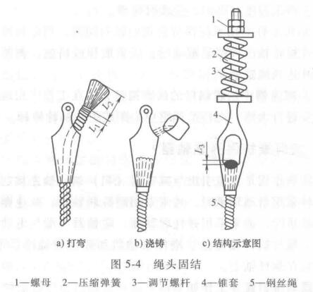 電梯是多繩提升,數(shù)根鋼絲繩共同承擔負載。多繩提升要求每根鋼絲繩受力均等,不允許個別鋼絲繩受力過大(即繃得太緊)。因此電梯都有鋼絲繩張力調整裝置,用擰緊或放松螺母改變彈簧力的辦法,即可調整鋼絲繩的張力(見圖5-4c)。彈簧還可起微調作用,瞬時平衡力由彈簧不長。由于數(shù)根彈簧性能有差別,因而不能用測量壓縮彈簧的長度來衡量鋼絲繩受力是否相等,更不能一次作為調整依據(jù)。