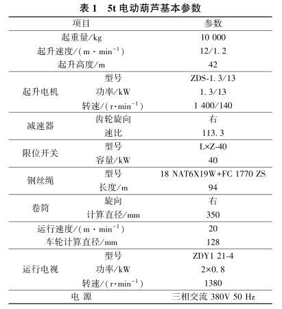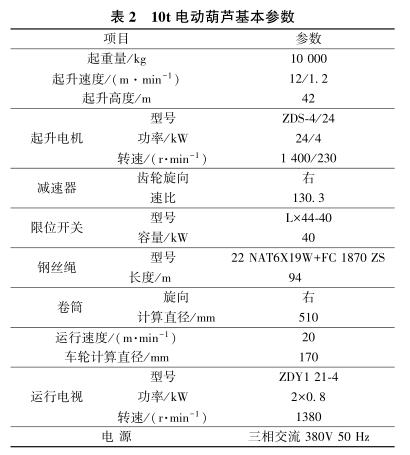 移動(dòng)式電動(dòng)葫蘆吊物系統(tǒng)主要由5,10t 電動(dòng)葫蘆、電動(dòng)葫蘆運(yùn)行軌道及電氣控制系統(tǒng)組成。 在結(jié)構(gòu)邊跨設(shè)吊物孔,吊物孔處1,2 層及地下室各層梁板結(jié)構(gòu)留空,在3層主體結(jié)構(gòu)梁下(高度≥8m),利用3層結(jié)構(gòu)梁板作為支承,支承梁板及洞口邊梁進(jìn)行結(jié)構(gòu)加強(qiáng)。移動(dòng)式電動(dòng)葫蘆吊物系統(tǒng)利用3層結(jié)構(gòu)梁預(yù)埋對(duì)穿螺栓、主體結(jié)構(gòu)施工時(shí)的支模架改作操作平臺(tái)及塔式起重機(jī)、手動(dòng)葫蘆等工具配合完成安裝,經(jīng)荷載試驗(yàn)及驗(yàn)收合格后方可使用。5,10t電動(dòng)葫蘆基本性能參數(shù)分別如表1,2 所示。