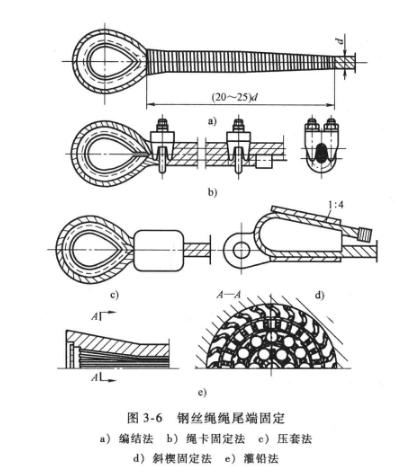 鋼絲繩在使用中需與其他承載構(gòu)件連接傳遞載荷,繩端連接處應(yīng)牢固可靠,常用的繩端固接方式(見圖3-6)。